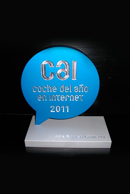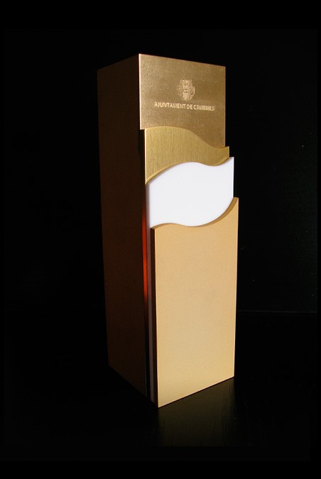 Dos tipus de guardons basats en la combinació alumini, amb acabats en or mate i brillant, i metacrilat blanc, en cos i principal i com a base. Placa identitària de llautó xapada en or de quirats.