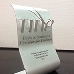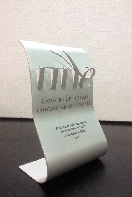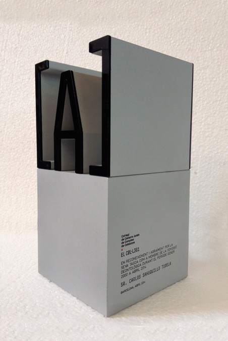 Guardó destinat com a reconeixment, fabricat en peça monobloc d’alumini troquelat amb precisió figures del logotip i posteriorment tapant els buits amb baquelita (celotex) amb la mateixa forma. Gravats en llom i frontal en profunditat i acabat en negre.