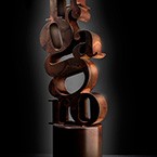 Vidre òptic amb figura gravada en 3D sobre una base d’alumini en la mateixa proporció formant una columna.
