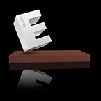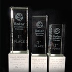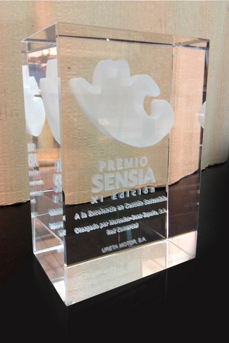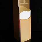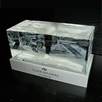 Combinació entre bloc de vidre òptic rectangular amb gravat interior en 3D i base rectangular massissa d’alumini amb acabats diferents en edició. Gravats en profunditat de logos i text.