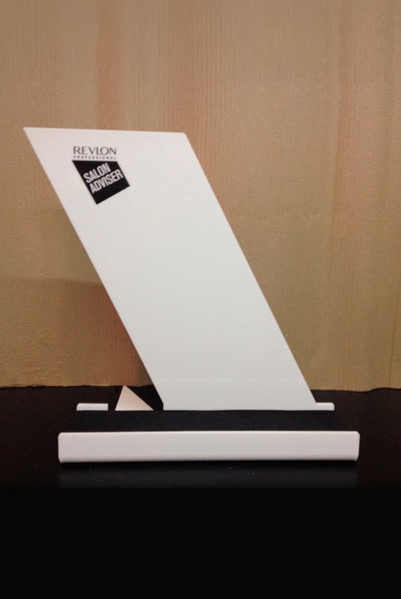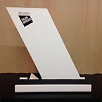 Expositor realitzat en metacrilat blanc plegat amb serigrafia i detall en la base, de coixí de cautxú.