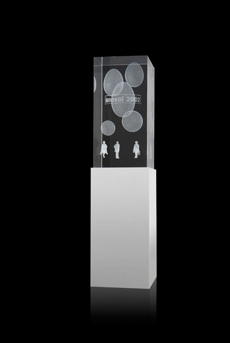 Combinació de vidre òptic amb imatge gravada en 3D i base metàl·lica amb gravat en profunditat.