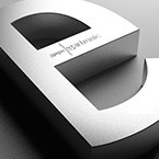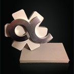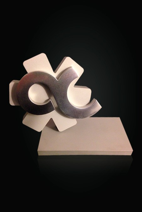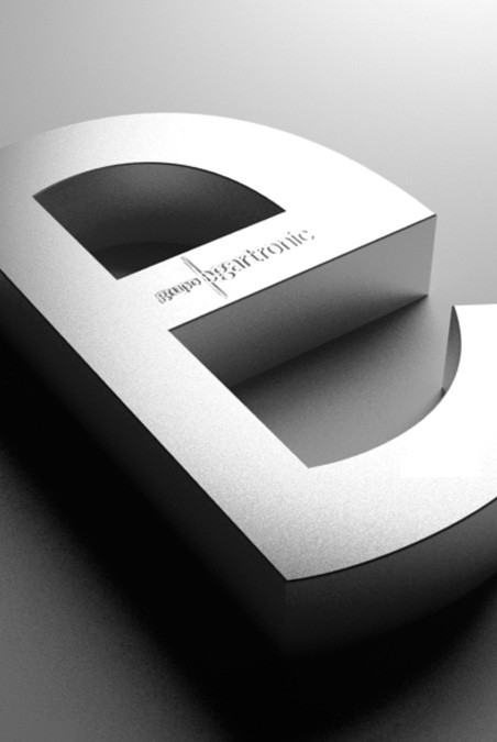 Lletra corpòria amb textura realitzada en alumini i subjectada en inclinació sobre base d’alumini negre.