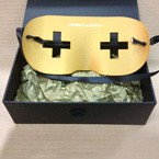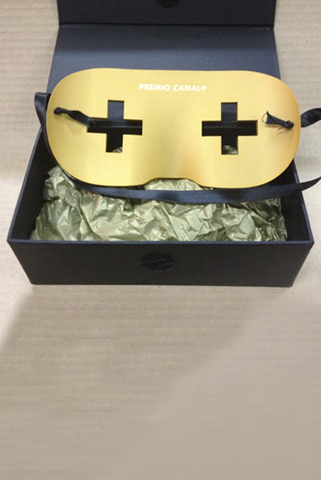 Concepte de màscara realitzada en alumini mecanitzat en 3D segons disseny, anoditzada completament en or mate amb gravat posterior en profunditat i finalment lacat frontal en negre (veta de filigrana).