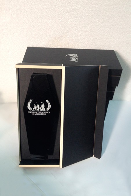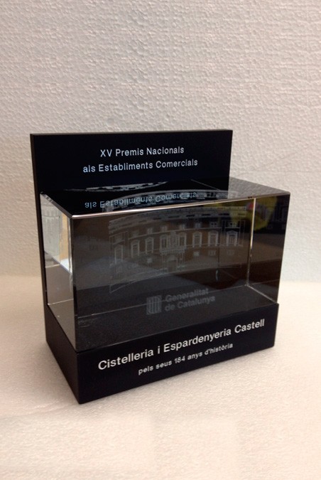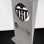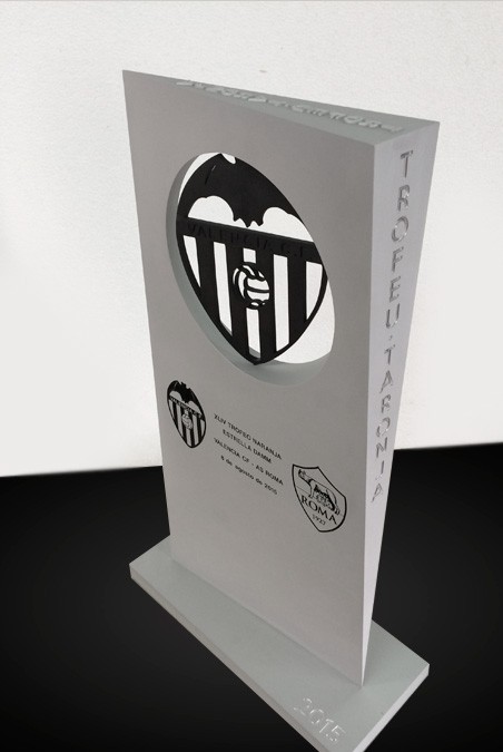 Trofeus realitzats en metacrilat negra amb forma de Taüt, test i logos anteriors treballats amb gravats en profunditat i colorejats en plata. Caixa d’estil japones feta a mida.