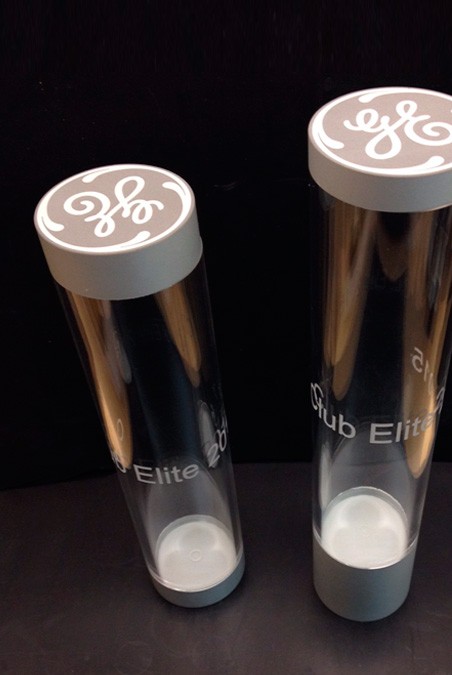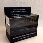 Producte destinat a guardar diploma, si mes no, d’una manera mes original i elegant. Realitzat en tub gruixut de metacrilat transparent amb gravat en contorn i tapes d’alumimi macis amb gravats en laser de logos.