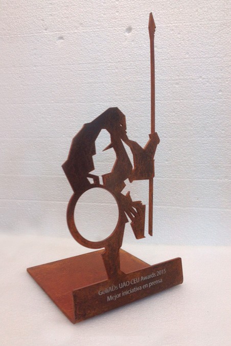 Trofeu conceptual realitzat en un cos únic i principal format de 2 peces d’alumini amb acabat negre i disseny del logotip troquelat a traves, i una fulla de xapa de llautó pulit i brillant colocada entremig com efecte reflectant. Gravats de texts en profunditat i en color or.