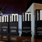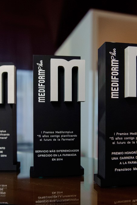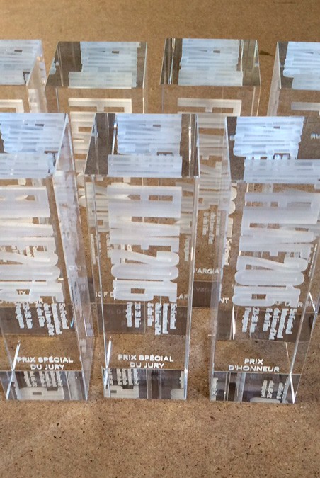 Varietat de guardons en colors i formes segons diferents categories realitzats tots sota una mateixa combinació de metall i vidre òptic gravat en 3D d’imatges corresponents i texts en profunditat.