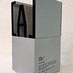 Combinació entre bloc de vidre òptic de grans dimensions amb gravat interior en 3D i base cúbica massissa d’alumini amb acabat rugòs i plata mate.